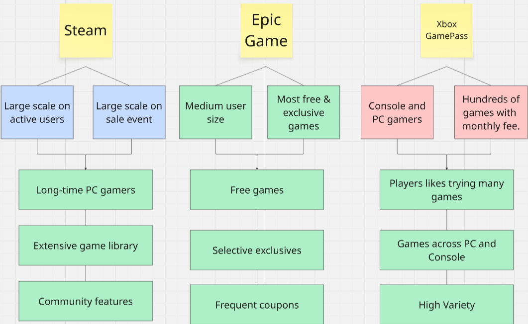 Overall, Steam has the largest scale with the most monthly active users. Epic Games ranks second, and Xbox comes last.